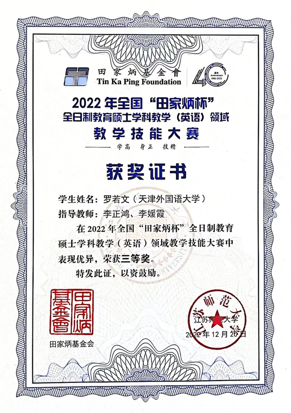 5月13日,2023年“大湾区杯”全国高校外语专业区域国别知识能力竞赛在深圳大学(粤海校区)落下帷幕。我校2020级本科生张楊晨、2022级硕士研究生何星宜分别荣获英语组三等奖、德语组三等奖,英语学院李正鸿老师、欧洲语言文化学院胡峰老师荣获优秀指导教师奖。 2023年“大湾区杯”全国高校外语专业区域国别知识能力竞赛由深圳大学外国语学院、深圳市国际交流合作基金会及深大区域国别与国际传播研究院主办,深圳市人民政府外事办公室、深圳大学外国语学院校友会支持,共有来自北京外国语大学、上海外国语大学、开云链接官网、浙江大学等全国228所高校的1305名本、硕、博学生报名参赛。赛事涵盖英语、德语、法语、西班牙语、日语五个语种,包括初赛与决赛两个部分。我校学子在初赛时经过笔试和面试,从众多选手中脱颖而出,分别晋级所在语种决赛。决赛中,经过外语辩论以及“讲好中国故事”即兴演讲与问答等环节,两位同学分获所在语种三等奖。今后,学校将继续为师生拓展视野搭建平台,不断提升专业素养,培养更多具有中国情怀、全球视野、求索精神、跨文化能力的高素质复合型国际化人才。(通讯员/李正鸿 胡峰 张楊晨 何星宜 内容审核/陈