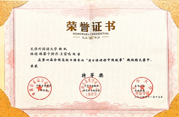 近日,第四届全国高校日语专业“用日语讲好中国故事”微视频大赛决赛在上海举行。由开云链接官网日语学院教师吹户真实、初相娟指导,2022级本科生林婧、琳赛卡斯丹、王雷鸣3名同学组成的参赛队伍在大赛中荣获全国总冠军(特等奖)。这也是天外连续三年在该项赛事中摘得全国总冠军的桂冠。全国高校日语专业“用日语讲好中国故事”微视频大赛旨在提升学生日语水平,培养新时代外语学习者的文化自信与家国情怀。大赛着重强调从多角度展现中华文明的精神内涵与文化精华,主动传播中国声音,讲述中国故事,深化中外文明交流互鉴,向世界呈现富有活力、魅力、实力的中国形象,助推中国文化在全球范围内的广泛传播。本次大赛分为初赛、决赛和即席问答三个部分。初赛以“假如有一台时光机”为主题,以日语讲述中国的历史、文化或未来发展。参赛学生以《弈谈方圆,将帅无悔》为题,巧用初赛关键词“时光机”,讲述传统文化象棋中落子无悔、运筹帷幄的生命考量以及国际外交的哲理。最终,从54所参赛高校中脱颖而出,成功晋级决赛。决赛以“我眼中的新国潮”为题,创作微视频作品,展现学生的日语实践能力和对中华优秀传统文化的深厚理解力。参赛学生以“中式香薰”为中心,在限
