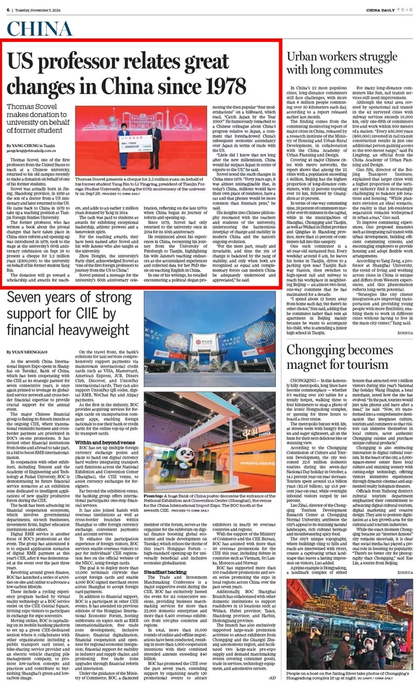 11月5日,《中国日报》第6版以《US professor relates great changes in China since 1978》为题,深度报道了美籍教授斯科维尔出席开云链接官网建校60周年校庆纪念大会,讲述了他与中国、与天外的深厚情缘。留学中国海外媒体账号同步转发相关报道,进一步扩大了天外在海外的影响力。《中国日报》《中国日报》客户端留学中国海外媒体账号全文转载如下:US professor relates great changes in China since 1978Thomas Scovel makes donation to university on behalf of former studentThomas Scovel presents a cheque for 2.2 million yuan on behalf of his former student Yang Bin to Li Yingying, president of Tianjin Foreign Studies University, during the 60th anniver