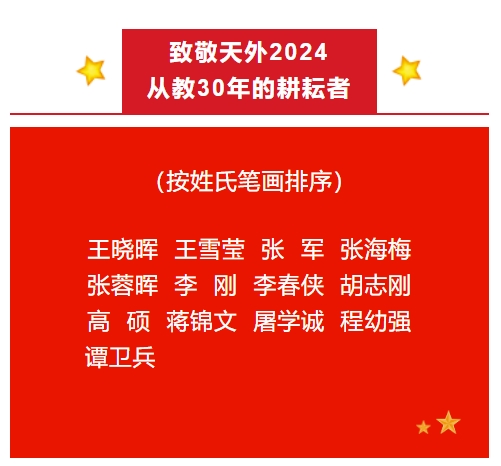 三十年前他们意气风发,风华正茂三十年后他们依然坚守,无私奉献他们将最美好的青春年华挥洒在天外校园今天,让我们一起致敬这群最可爱的人!回望这30年:天外踵事增华,母校日新月异。我历经诸多工作岗位,接触到思想深邃的学者、勤勉博学的青年才俊和风华正茂的莘莘学子。记忆中有过无数“与君一席谈,胜读十年书”的惊喜与感叹,诸位良师益友的教诲与启迪,令我宏阔视野、积思顿悟、受用终身。——王晓晖莫道桑榆晚,为霞尚满天,在天外的三尺讲台上传道、授业、解惑三十载,成为我一生的精神财富。我深切感受到,教育是育人育己的过程,以“十年树木,百年树人”为古训,用一颗温柔心,做学生的良师益友。——王雪莹留校任教至今已整整三十载。热爱藏于心,何惧岁月长。《人间草木》里有这样一句话:“陪我门口的花坐一会,当个守护花开的使者。”教育,是春风雨露般的滋养。它让叶生长,让根纵横,让年轮蔓延,直到蓓蕾绽放,细嗅迷人芬芳。——张军三十载弹指一挥间,我见证了学校一次次的转型发展,感受着为之奋斗的艰辛和荣耀,岁月不居,时节如流,感恩学校的培养,我会继续坚守这份初心与执着,在时光的洪流中勇毅前行。——张海梅弹指一挥间,教坛耕耘三十载。在