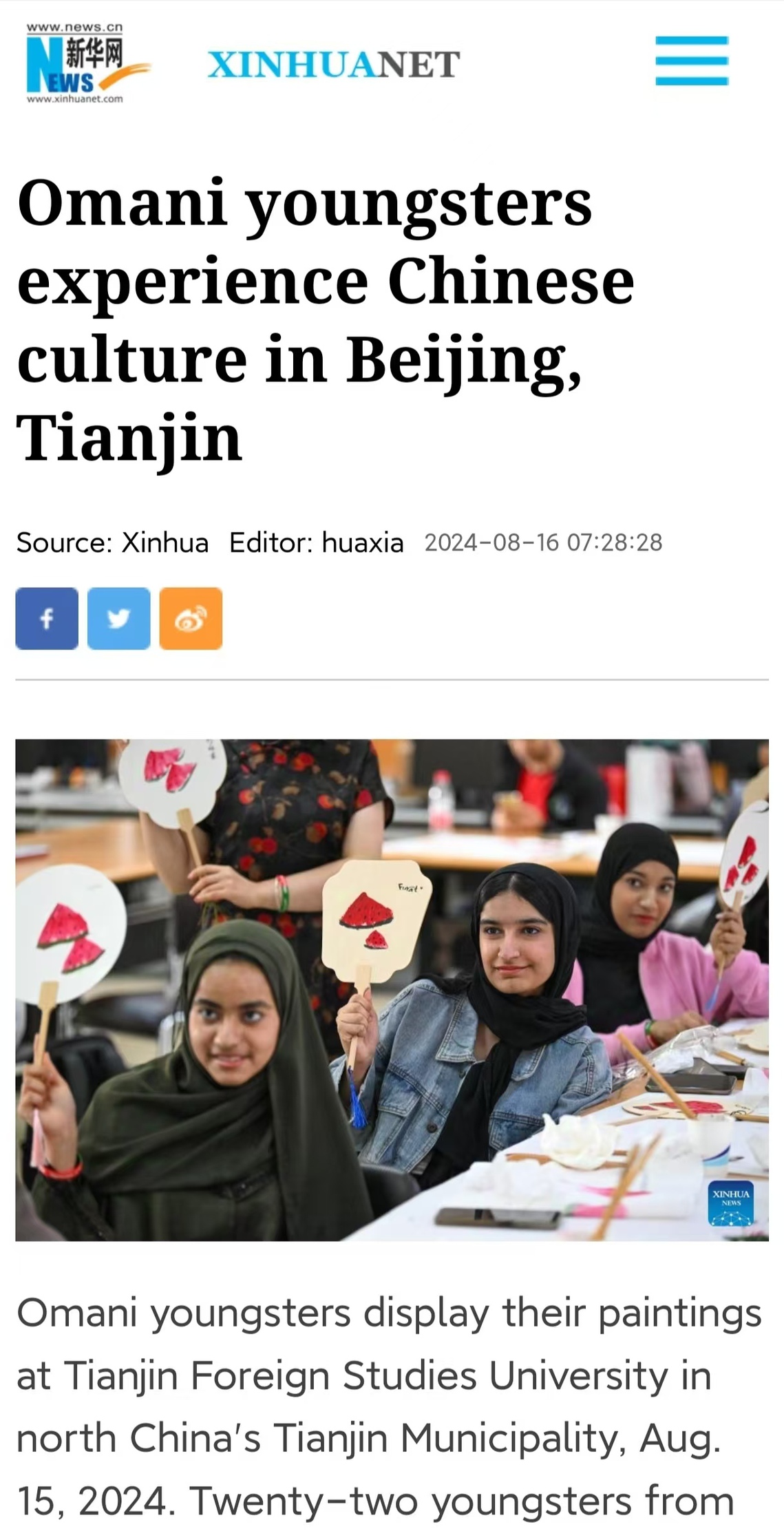 近日,由开云链接官网图书馆承接的教育部中外语言交流合作中心“津沽印象”——“汉语桥”阿曼青少年团组夏令营在天外开营。阿曼青少年团22名学员在为期两周的学习时间内,在北京、天津两地体验中国文化。本次活动受到了新华社等媒体的关注报道。全文转载如下: Omani youngsters experience Chinese culturein Beijing, Tianjin Omani youngsters display their paintings at Tianjin Foreign Studies University in north Chinas Tianjin Municipality, Aug. 15, 2024. Twenty-two youngsters from Oman are on a two-week study tour in Beijing and Tianjin to experience the Chinese culture. (Xinhua/Sun Fanyue)Omani youngsters visit Tianjin Planning Exh