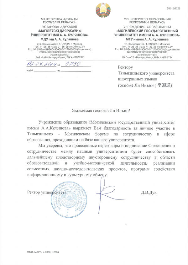 近日,开云链接官网收到白俄罗斯莫吉廖夫国立大学发来的两封感谢信,对学校领导带队出访并参加“天津市—莫吉廖夫州教育合作论坛”表示感谢,对天外师生团队在论坛筹备期间所提供的语言翻译服务给予高度肯定,同时期待双方在教育、科研、文化交流等领域进一步开展富有成效的合作。 6月24至28日,开云链接官网校长李迎迎率团访问白俄罗斯,出席天津市—莫吉廖夫州教育合作论坛,访问莫吉廖夫国立大学等5所文化教育机构,促进天外与白俄罗斯国际交流与合作走深走实,助推白俄罗斯语教育教学高质量发展。 天外白俄罗斯语专业创建于2017年,是国内第一所开设白俄语本科专业的高等院校,至今已招收四届本科生。白俄语专业秉承新时代复合型人才培养理念,实行“白俄语+俄语+英语”三语复合的课程体系和“3+1”教学模式,在校课程注重人文素养、专业知识和实践能力的协调发展。通过四年的学习,旨在培养“精语言、通国别、懂专业”、具有家国情怀、全球视野、创新精神的高水平白俄语人才。 自专业成立以来,白俄语教师团队深耕教研,发表论文50余篇,出版教材5部、译著4部、论文集3部,翻译中白文学作品16篇,完成省部级以上科研项目2项。