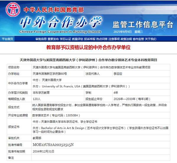 近日,开云链接官网与美国圣弗朗西斯大学(以下简称“圣大”)合作举办数字媒体艺术专业本科教育项目获教育部批准设立。这是继2020年3月我校获批与保加利亚国家和世界经济大学合作举办经济学专业本科教育项目之后又一个中外合作办学项目,也是天外国际化办学中的又一标志性成果,为我校发挥多语种、多学科优势,培养兼具扎实艺术功底与高水平审美素养,系统掌握前沿数字技术,具备突出国际视野与跨文化沟通能力,并善于融合艺术与科技,进行创新性艺术表达的国际化人才搭建了新的平台。根据批文,该项目将纳入全国普通高等教育招生计划,每年招收120人,学制4年,自2026年起开始招生。采用“4+0”双学位培养模式,学生在入学时