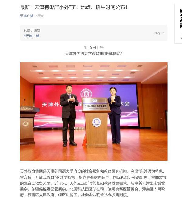 1月7日,天津广播以《最新 | 天津有8所“小外”了!地点、招生时间公布!》为题目进行了报道。