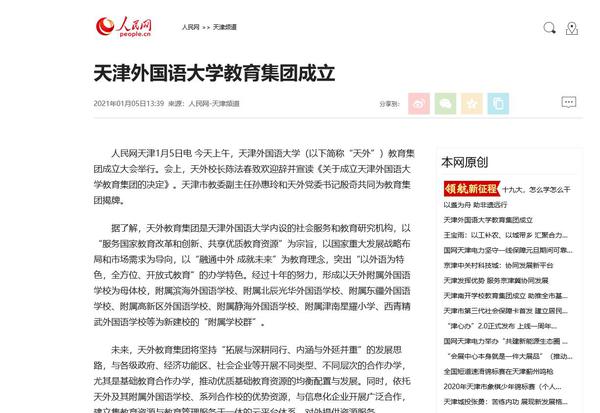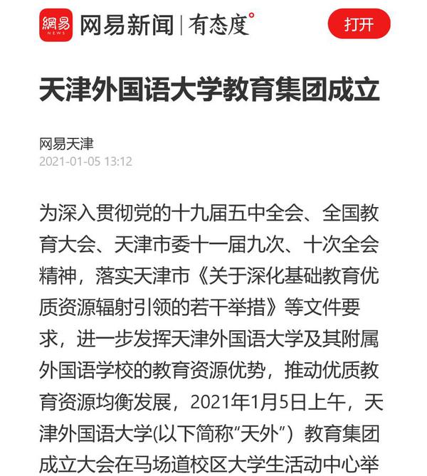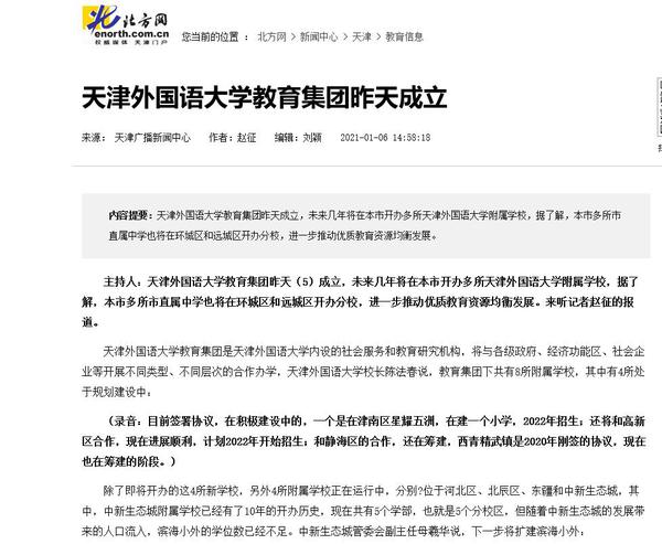 为深入贯彻党的十九届五中全会、全国教育大会、天津市委十一届九次、十次全会精神,落实天津市《关于深化基础教育优质资源辐射引领的若干举措》等文件要求,进一步发挥开云链接官网及其附属外国语学校的教育资源优势,推动优质教育资源均衡发展,2021年1月5日上午,开云链接官网教育集团(以下简称“天外教育集团”)成立大会举行,受到多家媒体关注报道。
