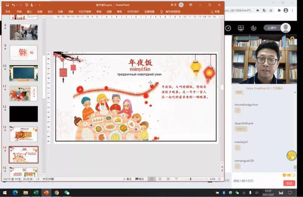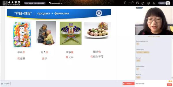 汉语课程由欧洲语言文化学院副院长史亚军、乌克兰基辅国立语言大学孔子学院中方院长于鑫、俄语系负责人付美艳、孔子学院专职教师王瑜琴、张洋等具有海外孔子学院工作经历的五位教师负责。为确保良好的教学效果和更好的云端体验,并配合天津三大国家级非物质文化遗产的教学,五位教师精心编写了相关的教学材料,把汉语教学与天津三大国家级非物质文化遗产的教学有机地结合起来,突出了此次线上团组交流“云”体验项目的特色。在汉语教学中融入了杨柳青木版年画、狗不理包子、泥人张彩塑、书法、剪纸、春联等有关内容,学员们在学习汉语的同时也了解了相关的文化知识。