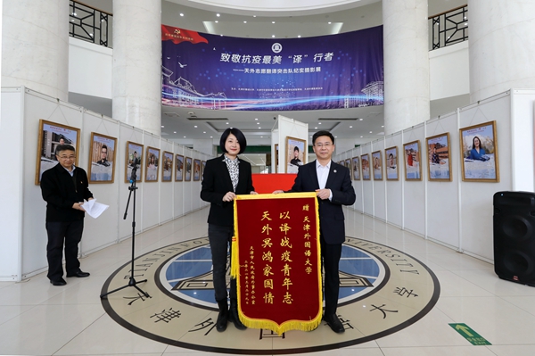仪式上,殷奇、包静共同为摄影展揭幕。市外办向我校赠送了锦旗,团市委向天外志愿翻译突击队成员代表颁发证书。于富来为志愿翻译突击队教师代表赠送了照片。突击队学生代表王清杨以《守护》为题向大家分享了自己难忘的志愿服务经历,鼓励天外学子积极发挥专业优势,服务国家和社会需要。