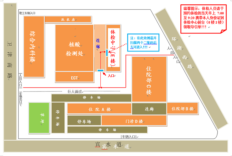 1.体检当天请携带体检人身份证,在E楼一楼扫行程码进行查询(根据疫情变化,到过高风险及中风险地区的查体者谢绝体检),扫码测体温合格后,方可进入,上二楼打出导诊单进行体检。