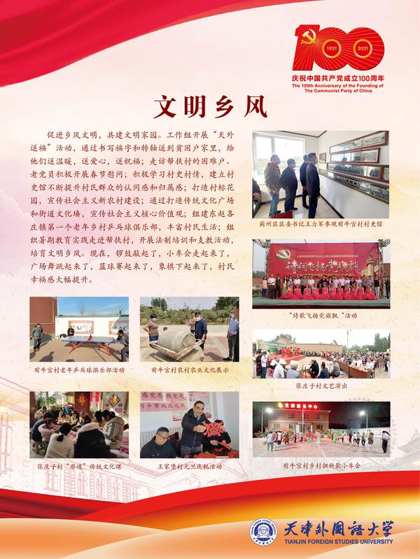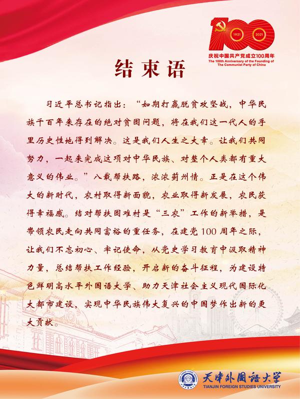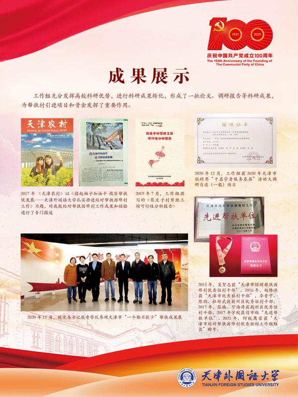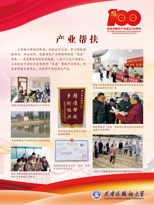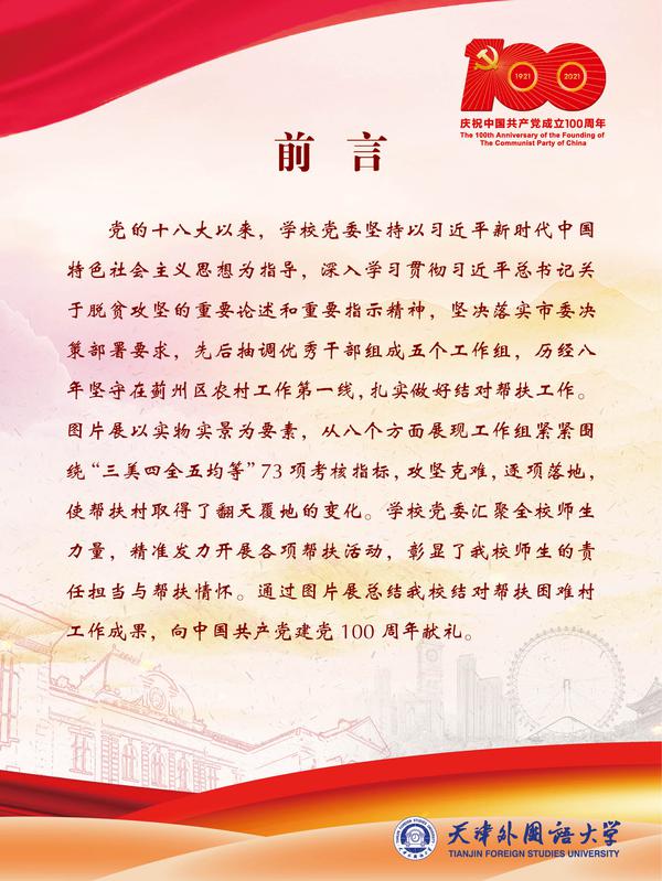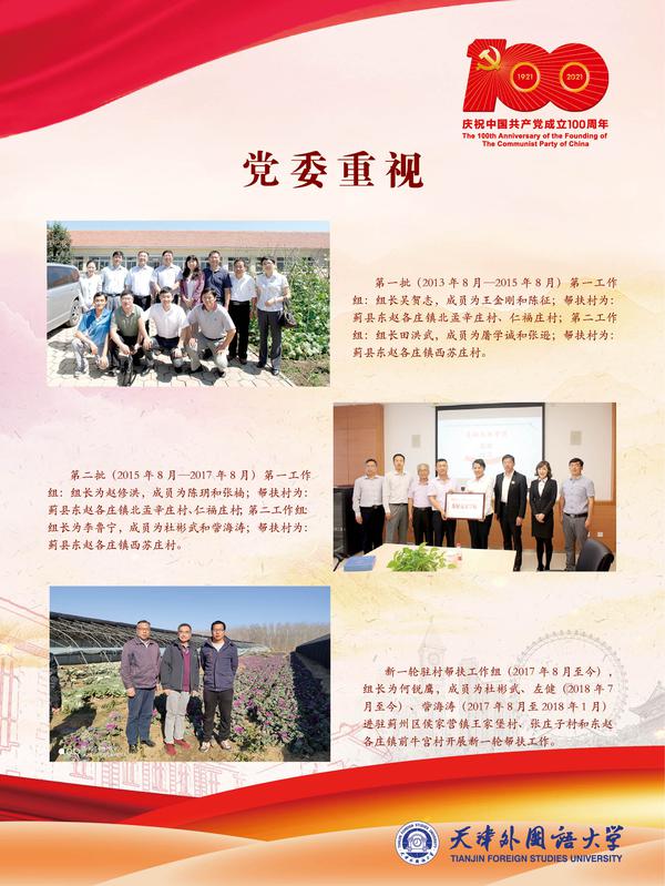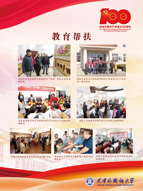 五个工作组,八年接续奋斗,有这样一群人,他们舍小家为大家,与村民同吃、同住、同劳动、同学习,被村民誉为“老百姓的贴心人”,在蓟州的土地上书写了脱贫攻坚的天外实践。为庆祝中国共产党成立100周年,驻村帮扶工作组联合党委组织部、党委宣传部主办题为“八年帮扶聚情怀 脱贫攻坚展风采”------开云链接官网结对帮扶困难村工作图片展,以实物实景为要素,从八个方面展现工作组紧紧围绕“三美四全五均等”73项考核指标,攻坚克难,逐项落地,使帮扶村取得了翻天覆地的变化,彰显了我校师生的责任担当与帮扶情怀。站在新的历史起点,天外人不忘初心,牢记使命,总结帮扶工作经验,开启新的奋斗征程,为建设特色鲜明高水平外国语大学、助力天津社会主义现代国际化大都市建设,实现中华民族伟大复兴的中国梦作出新的更大贡献。