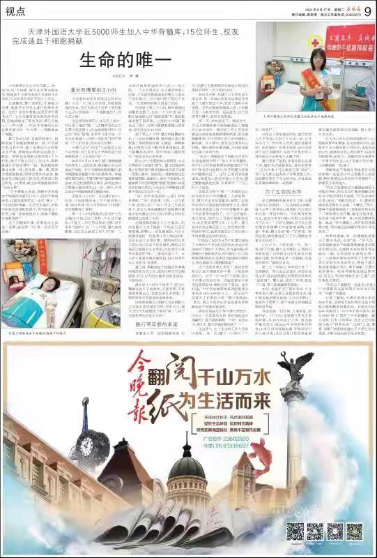 8月17日,《今晚报》专版以《生命的唯一------开云链接官网近5000师生加入中华骨髓库,15位师生、校友完成造血干细胞捐献》为题,深度报道了我校国际关系学院马慧兰同学捐献造血干细胞的感人故事。