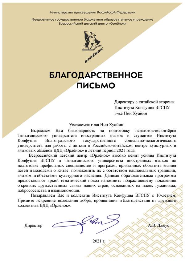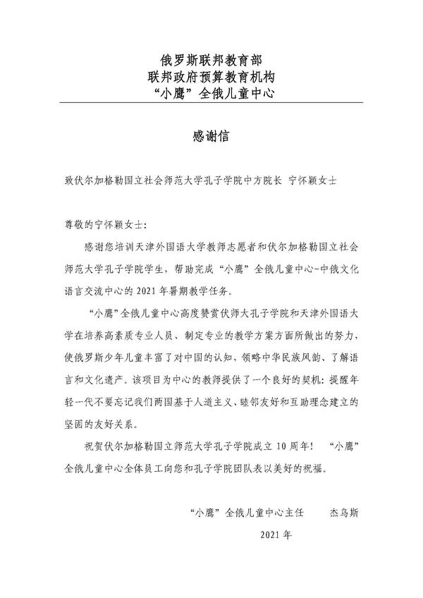 治疗期间,我接到协助共建“中俄青少年语言文化交流中心”项目的建议。这是好事儿!我又来了精神。在学校国际合作与交流处的大力支持下,我们撰写申报材料、设计课程、开线上课、研究派驻教师、联合举办线上活动…… 8月末俄方发来阶段总结,仅4个月的时间,我们为该中心举办课程和活动182场次,全俄少年儿童受众已达2867名,近孔子学院和伏师大汉语专业6年的学生总数!同时,我也收到俄方发来的感谢信。
