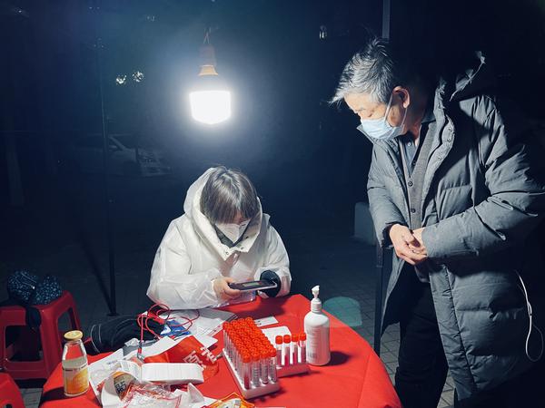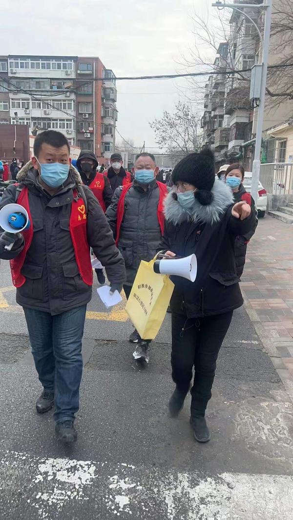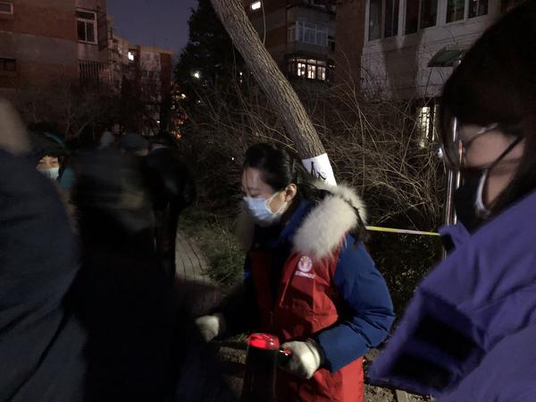 教务处王济军老师义不容辞担当起了志愿者并化身宣传员,用相机记录社区一线工作人员忘我工作、守护家园的身影,他主动引导、维持秩序,为残障老人推轮椅,为老弱小安排绿色通道等。周凯老师夫妻俩安顿好孩子后,成为社区内的夫妻志愿者搭档,从9日晚上起就投入引导秩序、协助入户检测等工作,因社区楼宇分散,12日结束第二轮筛查最后一个点位的工作已近零点。马慧老师组织居民以10人为单位进行登记、检测,合理引导高龄老人、体弱病人和低龄儿童通过绿色通道快速检测,尽量减少寒冬天气的室外等待时间,同时耐心解答居民关于防疫的各种问题。窦伟老师与爱人在全城启动第一次大筛之前,便早早去景兴西里社区报到,12日晚上,社区二筛如火如荼,得知夜晚社区人手不足,当孩子进入梦乡后,她主动下沉社区,承担夜间至凌晨班次,直到社区完成二筛。