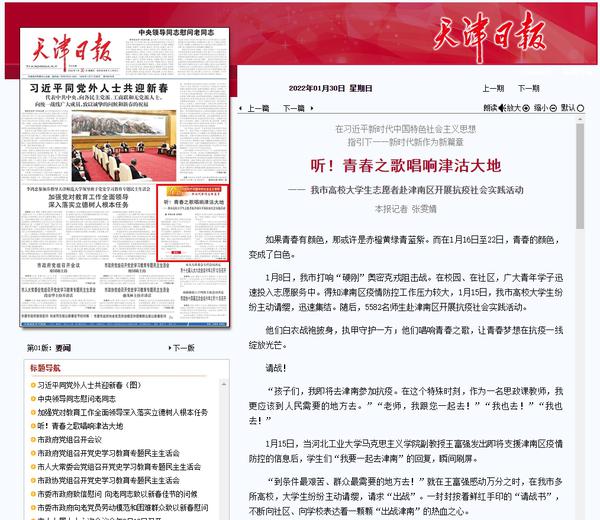 1月30日,《天津日报》头版《在习近平新时代中国特色社会主义思想指引下—新时代新作为新篇章 听!青春之歌唱响津沽大地------我市高校大学生志愿者赴津南区开展抗疫社会实践活动》一文,聚焦我市打响抗疫阻击战,广大青年学子投入志愿服务,主动请缨,迅速集结,赴津南区开展抗疫社会实践活动。文中讲述了我校学子孙嘉迪的抗疫故事: