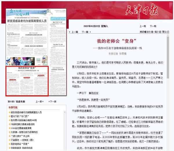 1月22日,《天津日报》第三版《我的老师会“变身”!天津10万名干部教师奋战在抗疫第一线》一文,聚焦我市教育系统超过10万名干部教师放下粉笔,暂别讲台,投入抗疫一线。文中讲述了我校保卫处陈欣老师闻令而动,逆行出征的故事: