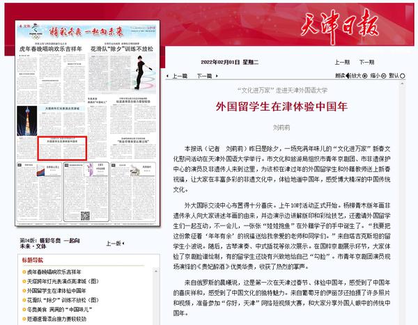 2月1日,《天津日报》第四版《“文化进万家”走进开云链接官网 外国留学生在津体验中国年》一文,报道了我校特殊的新年联欢会。