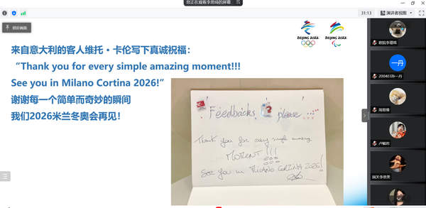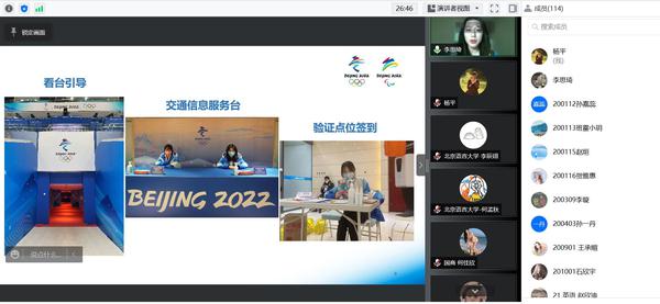 虽然宣讲不能面对面,但网络并不能隔断两校同学的心,对话框里不断弹出“感谢学姐的分享”“志愿者是最美丽的名片”“冬奥因你更美丽”……宣讲气氛十分热烈,宣讲会成为了一场“大思政课”,贡献青春力量,践行志愿服务精神,久久回荡在大家的脑海中。