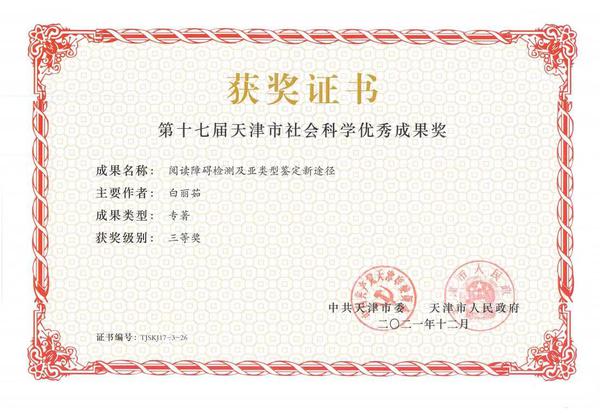 该成果荣获第十七届天津市社会科学优秀成果奖三等奖,证书编号:TJSKJ17-3-26。
