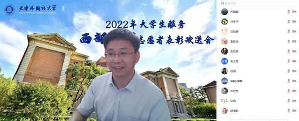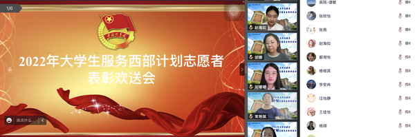 7月15日下午,我校2022年大学生服务西部计划志愿者表彰欢送会在线上举行。校党委副书记胡志刚出席会议,校团委和相关学院团委负责同志、2021年西部计划志愿者代表、2022年西部计划全体志愿者参加会议。
