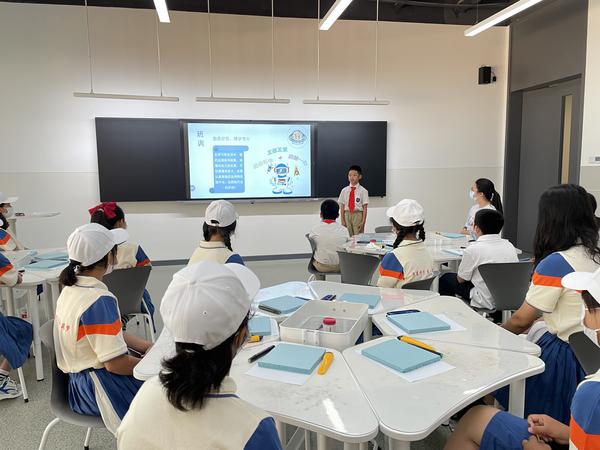 风华百年越青春,革命热血一脉承。马克思主义学院的高立军、李俊颖、唐卓三位教师以《学百年团史 担青春使命》为主题,为全体学生上了一堂生动的思政课。北辰小外学生代表分别以汉字“行”“达”“思”为例,讲解了班级汉字名片的涵义并对班级文化建设活动进行了介绍。
