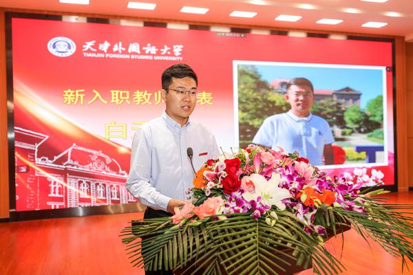 新入职教师代表、亚非语学院阿拉伯语系教师白天阳博士发言