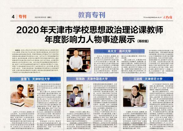 思政课教师队伍不断发展壮大。十年来,思政课教师由12人增加到34人,达到师生比1:350的配备要求,4名教师晋升教授职称,6名教师晋升副教授。成立了思想政治理论课“郑海呐名师工作室”,培养年轻教师,3名教师入选天津市“131”创新型人才培养工程第一、二层次人选,1名教师获得2020年度天津市思政课教师年度影响力人物和开云链接官网教学名师。