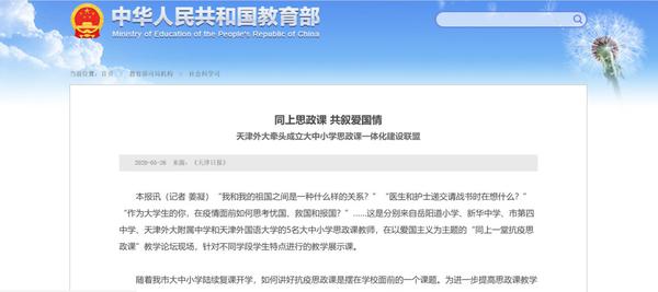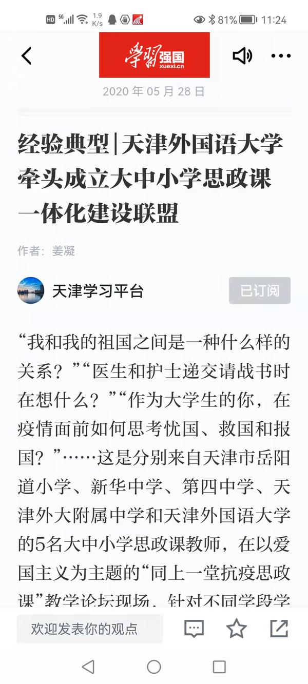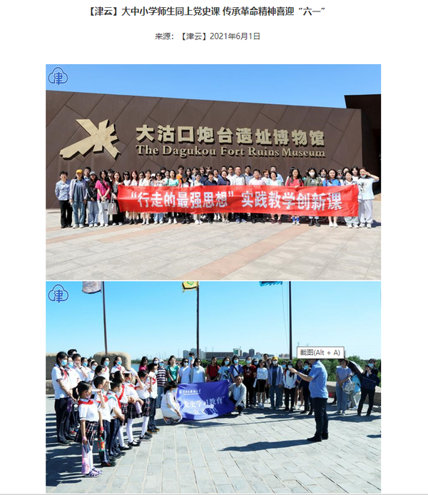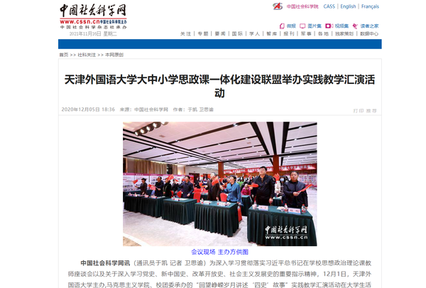 深入贯彻落实习近平总书记在学校思想政治理论课教师座谈会上重要讲话精神,把大中小学思政课一体化建设作为一项重要工程,2020年5月,联合新华中学、外大附中、岳阳道小学等10所中小学成立开云链接官网大中小学思政课一体化建设联盟,以实践教学一体化建设为重点,积极探索教育主体的整体性和不同学段的教学规律,构建“协同作战”思政课教育体系。组织了“同上一堂抗疫思政课”教学论坛、“回望峥嵘岁月 讲述‘四史’故事”实践教学汇演、大中小学生同讲红色展馆、赴北辰区中河头村安幸生烈士故居开展“传承红色基因、赓续红色血脉”大中小学思政课一体化实践教学活动。这些新颖、鲜活又富有实效的举措,打造了具有鲜明特色的大中小学思政一体化育人“天外模式”,为上好新时代的思政课,培养社会主义建设者和接班人做出了有益探索,受到《光明日报》《中国教育报》《天津日报》、天津电视台、学习强国等多家新闻媒体的广泛关注,产生了较大的影响力。2021年12月,市委领导来校调研指导工作,对我校大中小学思政课一体化取得的成绩给予充分肯定。