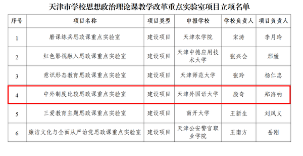建设中外制度比较思政课重点实验室。“中外制度比较思政课重点实验室”是天津市“大思政课”建设综合改革试验区的重要实施项目。项目以“融通中外、数智赋能、共建共享、实验创新”为建设理念,以“中外政治比较、中外经济比较、中外社会比较、中外生态比较、中外抗疫比较”五个比较方向构建起实验室建设的四梁八柱,通过打造实景化的中外制度对比平台,用“中外制度比较”的鲜活案例,引导学生更好地透过现象看本质、识大势、明规律,全面客观认识当代中国、看待外部世界,不断增强对中国特色社会主义的“四个自信”,为思政课文科实验室建设开拓全新路径。