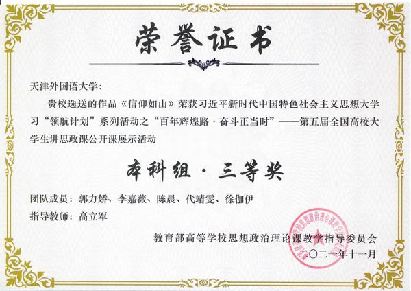 大学生学习思政课成效凸显。高质量的思政课激发了学生学习思政课的热情,多名学生考取了马克思主义理论专业的研究生,在天津市大学生思政课公开课大赛中多次获奖。特别是2021年郭力娇团队《信仰如山》荣获天津市大学生思政课公开课大赛(普通高校组)一等奖,创我校大学生参加该类比赛以来的最佳纪录,同时获得第五届全国高校大学生讲思政课公开课展示活动本科组三等奖。我校学子还获得天津市大学生“我心中的思政课”微电影大赛二等奖和三等奖。