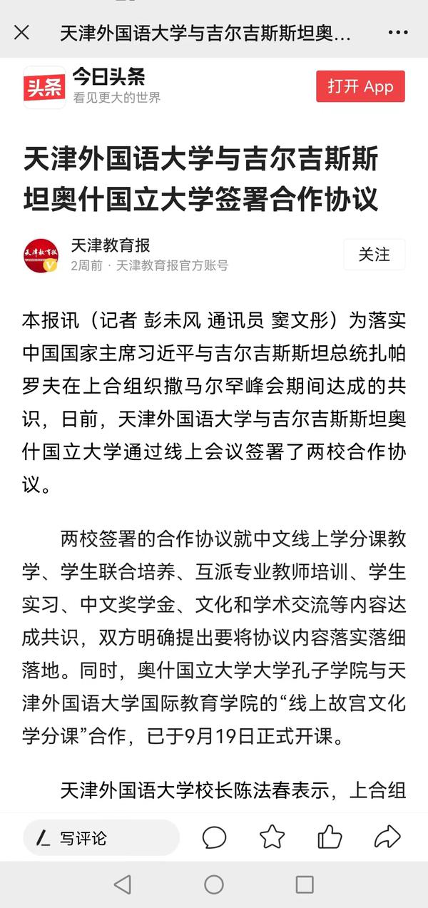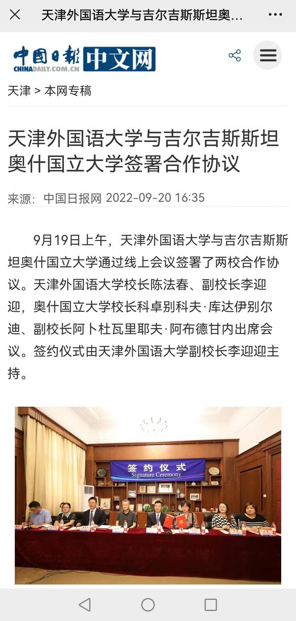为落实中国国家主席习近平与吉尔吉斯斯坦总统扎帕罗夫在上合组织撒马尔罕峰会期间达成的共识,9月19日上午,我校与吉尔吉斯斯坦奥什国立大学通过线上会议签署了两校合作协议。今年是中国与吉尔吉斯斯坦建交30周年,天津正积极推进与吉尔吉斯斯坦首都比什凯克建立友好城市,在此背景下,学校以天外之为服务天津城市国际化建设,服务中吉全面战略伙伴关系发展,为深化高质量共建“一带一路”合作,构建人类命运共同体贡献力量。人民日报客户端、中国日报网、津云、天津教育报、津门教育微信公众号、网易新闻、今日头条等多家媒体对此进行了报道。