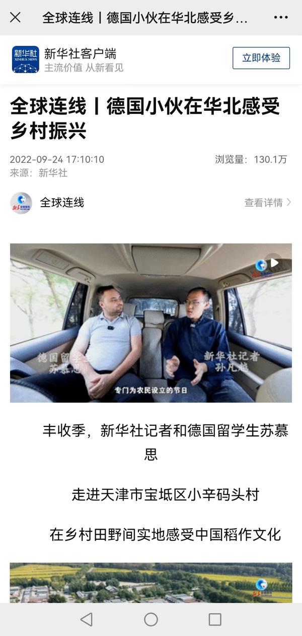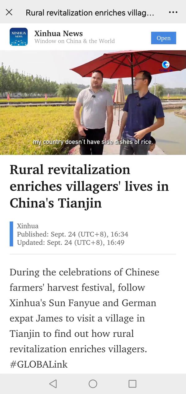 9月24日,在第五个中国人民丰收节到来之际,新华社天津分社采访我校德国留学生苏慕思,在新华社国际传播融合平台全球连线栏目播发丰收节特别策划节目《德国小伙在华北感受乡村振兴》。视频中,苏慕思跟随记者一起走进天津市宝坻区小辛码头村,在乡村田野间实地感受中国稻作文化。