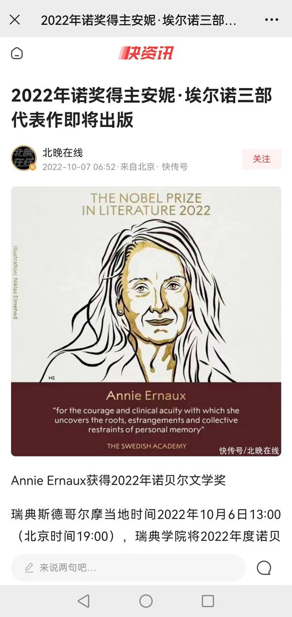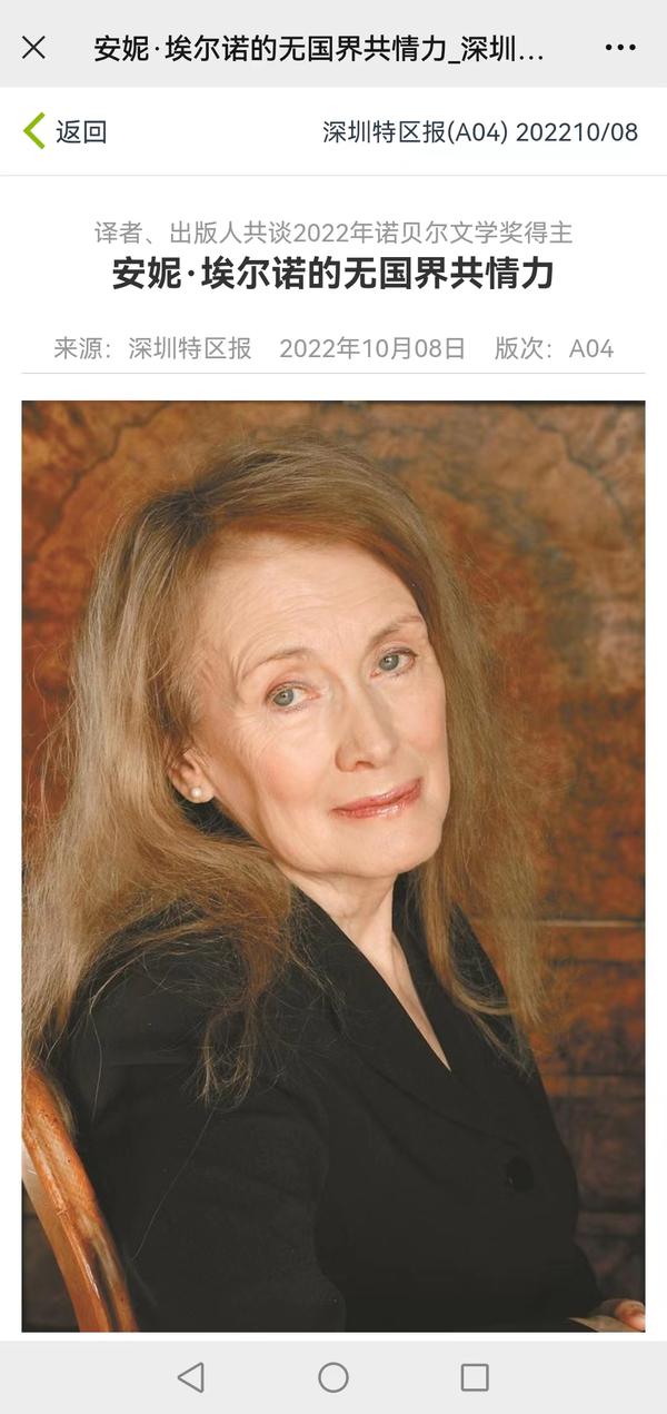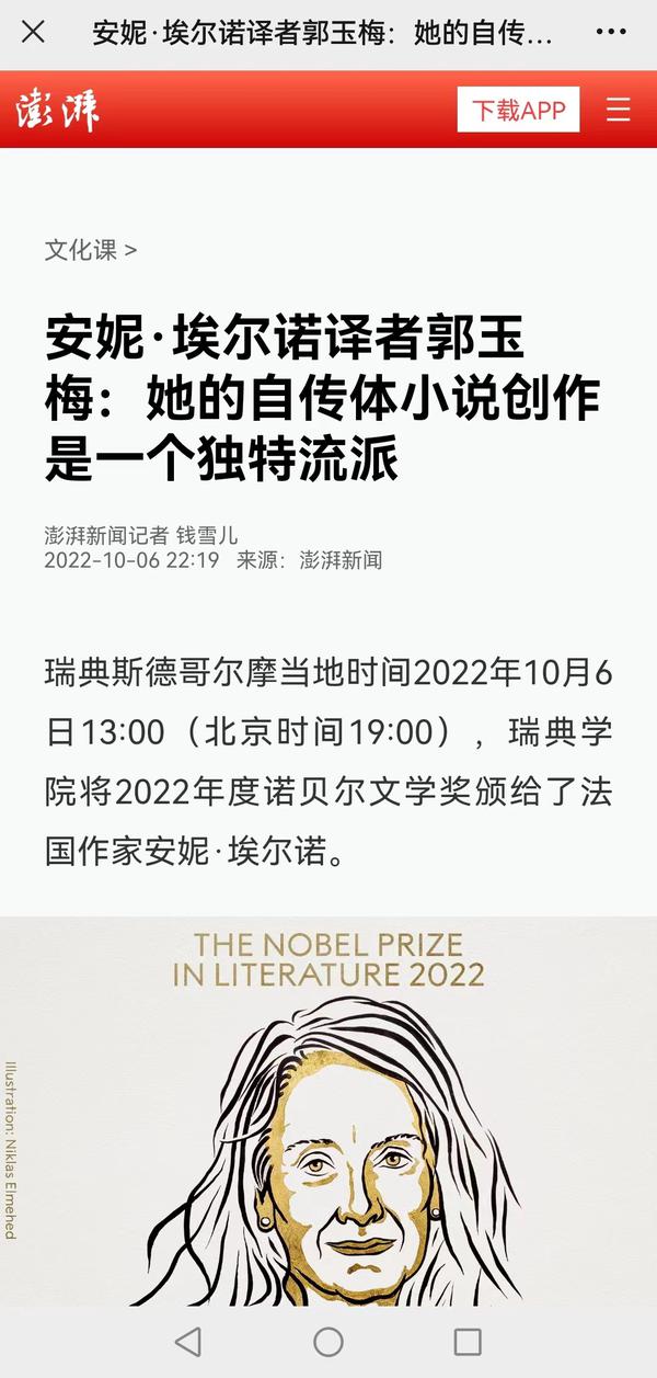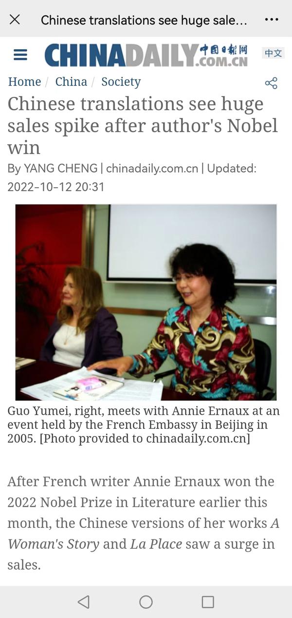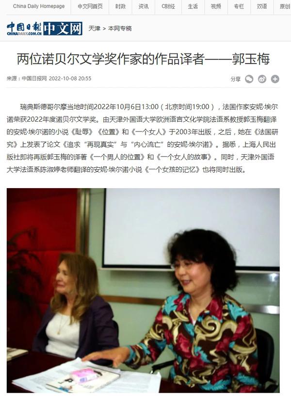 瑞典斯德哥尔摩当地时间2022年10月6日13:00(北京时间19:00),法国作家安妮·埃尔诺荣获2022年度诺贝尔文学奖。我校欧洲语言文化学院法语系教授郭玉梅作为安妮·埃尔诺的小说《耻辱》《位置》和《一个女人》的译者,以及另一位诺奖得主、2008年荣获诺贝尔文学奖的勒·克莱齐奥所撰写的《金鱼》一书的译者,先后受到了澎湃新闻、深圳特区报、上海文汇报等多家媒体的采访,人民日报客户端、中国日报网、天津日报、津云、网易新闻、北晚在线等多家媒体也对此进行了报道。