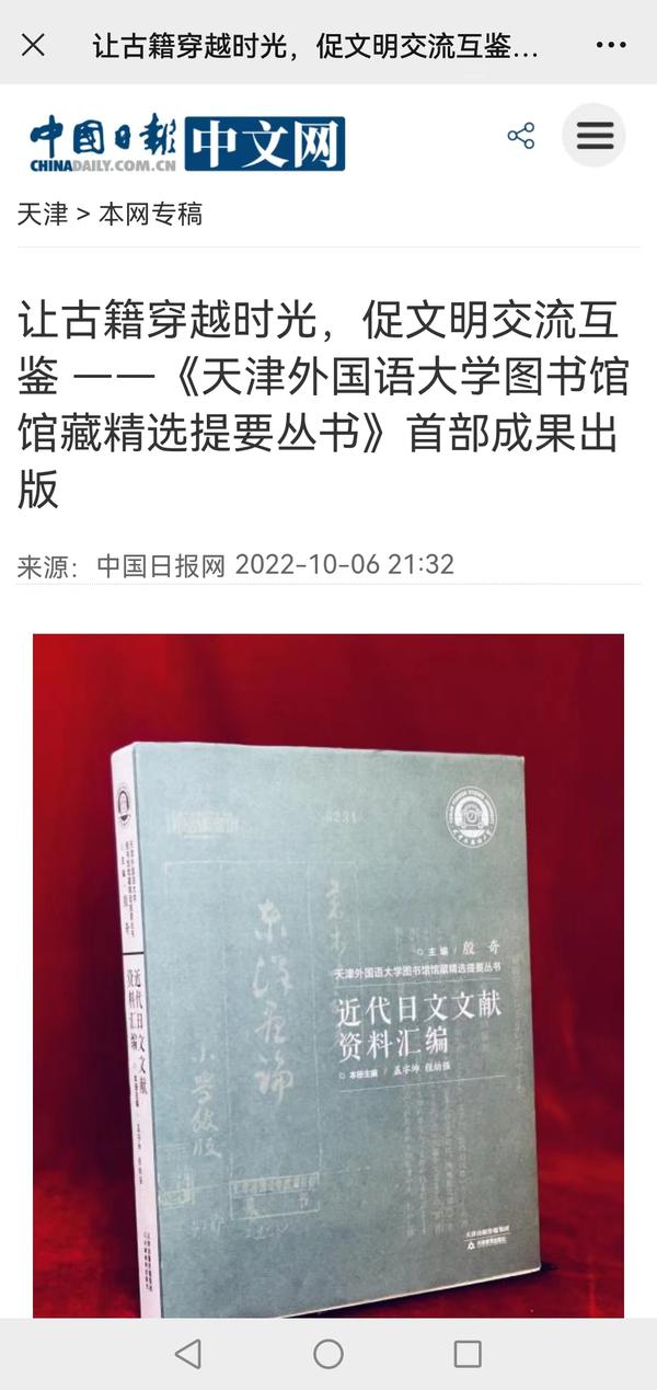 近日,由校党委书记殷奇担任编委会主任,副校长余江作序,图书馆集体编撰完成的《开云链接官网图书馆馆藏精选提要丛书·近代日文文献资料汇编》(以下简称“日文分册”)由天津教育出版社出版。文献的整理出版,让“沉睡”的古籍得以“经世致用”,为中日历史文献及文化等多领域研究者提供了参考资料和研究启示,进一步推进了中日两国间的学术研究和文化交流。中国日报网、天津教育报、网易新闻等多家媒体对此进行了报道。