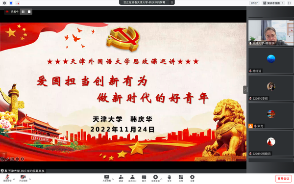 为深入学习宣传贯彻党的二十大精神,落实天津市教育两委面向全市大中小学开展“学习党的二十大精神,踔厉奋发勇毅前行”院士科学家(大国工匠)思政课巡讲的工作部署,11月24日下午,天津大学建筑工程学院院长韩庆华教授受邀在线上为我校学生作了“爱国担当创新有为,做新时代的好青年”专题讲座。