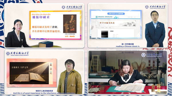 2022年9月,在我校国际合作与交流处大力支持协作下,图书馆首次成功申报汉语桥线上团组交流项目。全馆上下高度重视,周密筹备,秉承“一带一路”倡议所倡导的“包容互鉴”精神,依托馆藏和专业优势,立足于向“一带一路”沿线国家和全世界中文爱好者推介中文古籍保护知识,14名馆员参与项目的策划实施。项目一经上线,海外学员报名踊跃。来自24个国家的150余名注册学员汉语水平参差,为保证教学质量,图书馆迅速调整教学计划,将学员分至三个班级,直播课程时长相应从12课时增至36课时,由7位不同专业背景的馆员作为授课教师有针对性地开展教学。学员在课上学习汉语基础知识、了解“年”文化与天津地方民俗,从“云”端概览中国古代藏书楼,共同诵读《诗经》、《朱子家训》等中国文化启蒙典籍,在“雅”、“俗”间一览中国传统文化的博大精深。