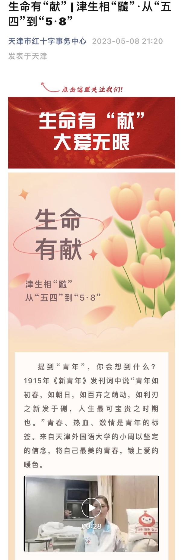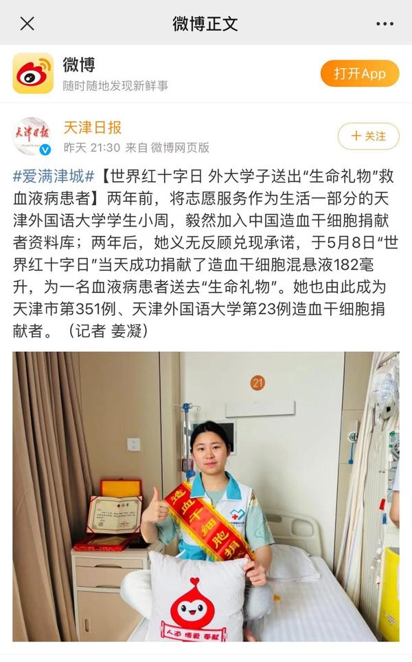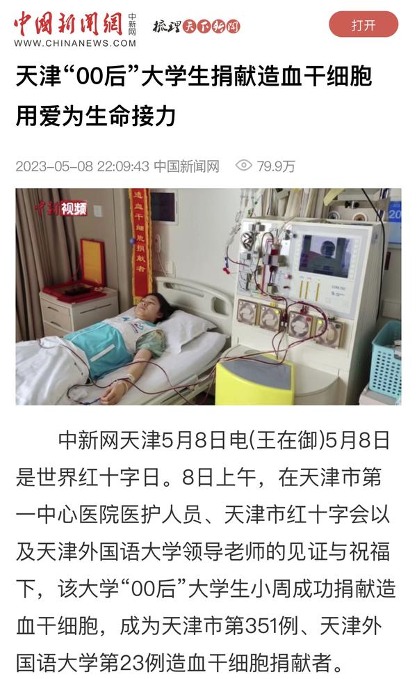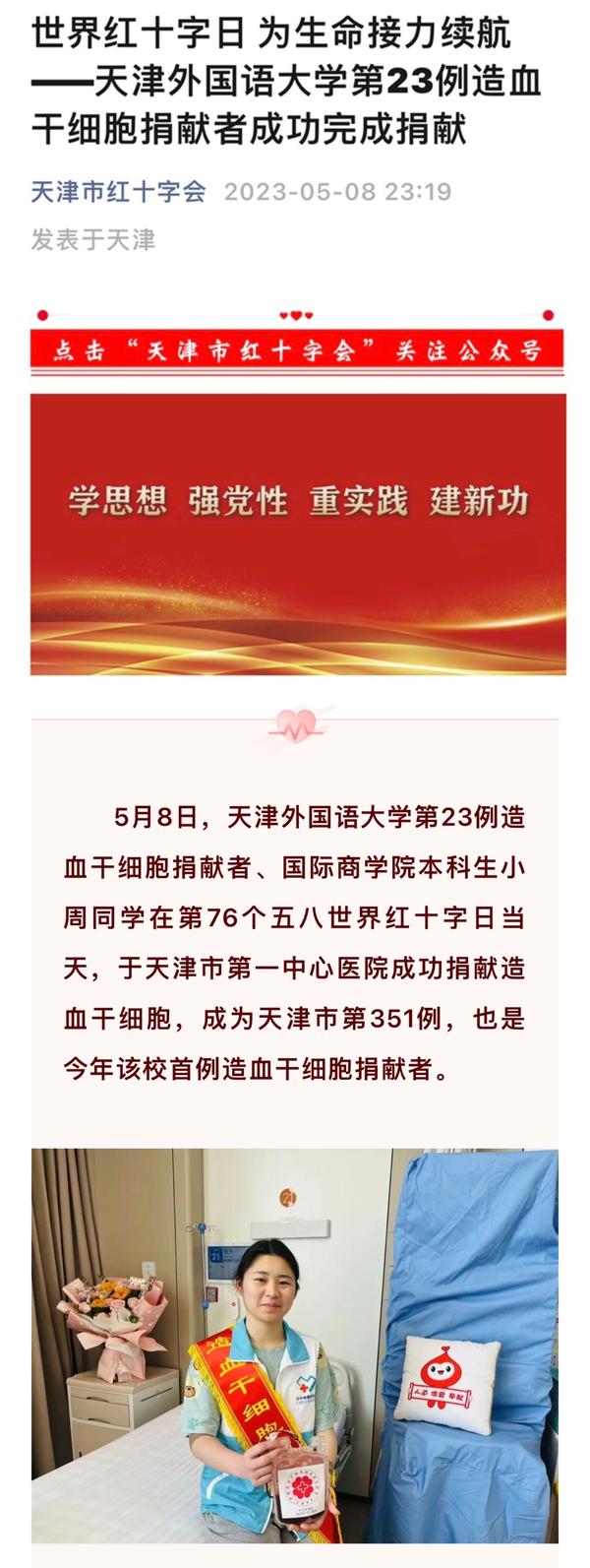 5月8日,我校“00后”大学生小周在天津市第一中心医院成功捐献造血干细胞,成为天津市第351例、我校第23例造血干细胞捐献者,为千里之外的血液病患者送去“生命的礼物”。