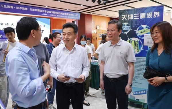 为推动学习贯彻习近平新时代中国特色社会主义思想主题教育走深走实,落实党中央、国务院关于高校毕业生就业工作的决策部署,落实科教兴市人才强市行动,促进毕业生爱津留津,为外语专业毕业生和用人单位搭建双向选择平台,5月15日下午,我校2023年多语种联合专场招聘会在马场道校区大学生活动中心举办。校党委副书记、校长陈法春,副校长余江现场指导工作,招生就业处、英语学院、欧洲语言文化学院、亚非语学院相关负责同志陪同走访。