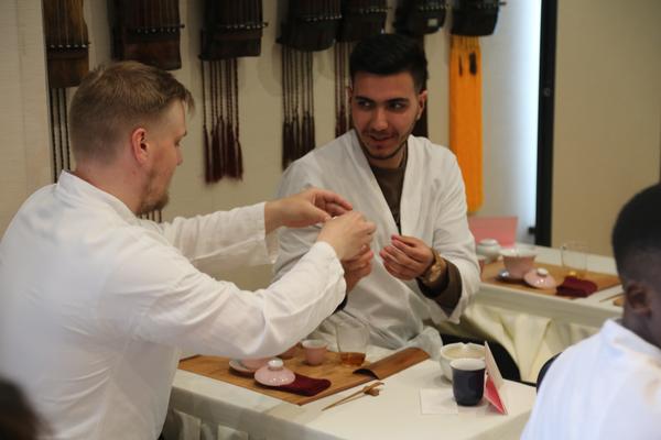 刘斌斌详细介绍了茶文化体验课的具体内容,带领留学生们一起了解中国茶文化与历史,学习茶桌上的礼仪,实操盖碗泡茶等。活动全程由经济学(中外合作)专业学生代表为留学生实时翻译。清茗雅轩创办人邢昱莹老师为师生进行了茶修仪轨的展示,从布置茶席开始,到主客行礼、温杯洁具、摇香传嗅、冲泡品茗、查看叶底等,讲述了中国茶文化的发展历程、茶叶分类等知识。留学生们以冲泡迎客茶开场,学习如何为他人敬茶、回礼、持杯等茶桌礼仪,并进行茶艺冲泡技能及清茗雅轩茶十二式实操训练,亲身体验中国茶艺,感受中华文化的魅力。