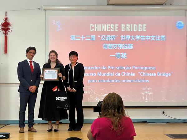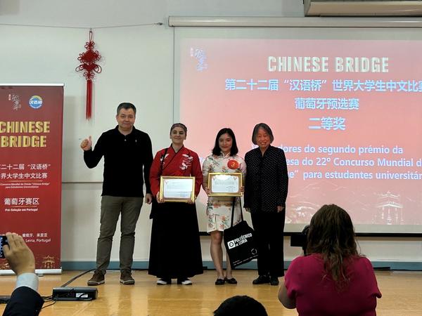 5月20日,由中国驻葡萄牙大使馆主办的第22届“汉语桥”世界大学生中文比赛葡萄牙赛区决赛在莱里亚理工学院举行。里斯本大学孔子学院的选手莫堇秋和裴爱梅分获一等奖和二等奖。莫堇秋将代表葡萄牙大学生参加全球“汉语桥”世界大学生中文比赛的总决赛。