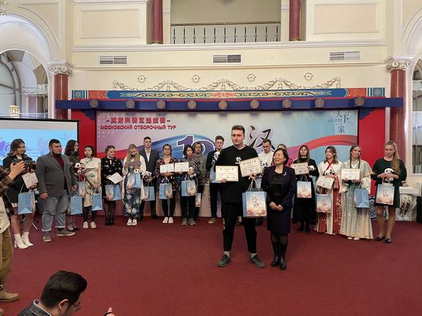 中国驻俄使馆文化参赞封立涛为一等奖获得者颁奖,左一为玛丽亚
