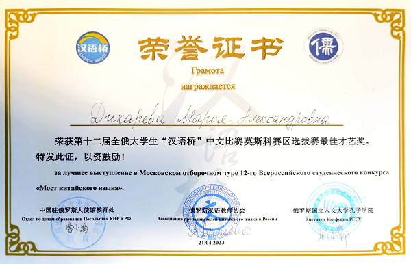 自今年3月初接到“汉语桥”比赛的通知后,按照比赛规定及相关要求,在中、俄方院长的大力支持下,中方教师开始对参赛选手进行专项训练。今年线下参赛人数,较去年14位线上参赛的人数增加了三分之一。经过激烈角逐,伏师大孔子学院派出的两位选手取得历年参赛的最好成绩,并将代表莫斯科赛区参加5月在伊尔库茨克举办的第十二届全俄“汉语桥”大学生中文比赛决赛。