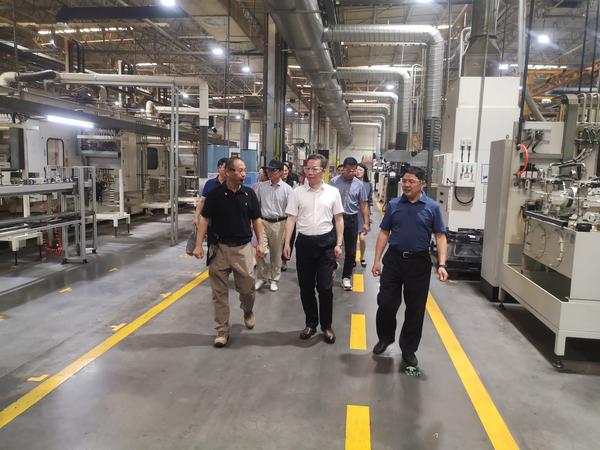 在天津港保税区人社局局长鲍官发的陪同下,余江一行参观了利纳马(天津)有限公司。