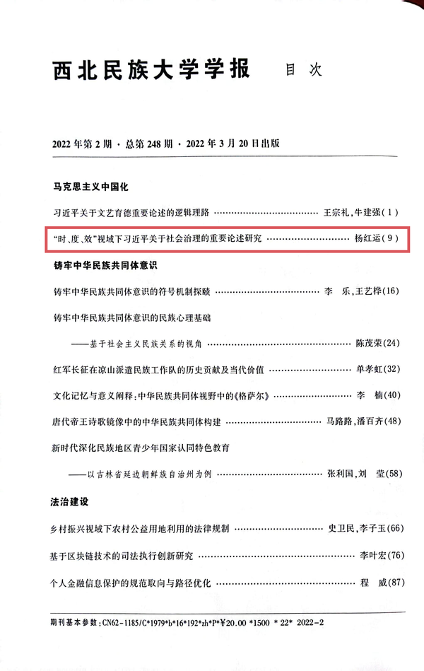 学术论文《“时、度、效”视域下习近平关于社会治理的重要论述研究》发表于《西北民族大学学报(哲学社会科学版)》2022年第2期,该刊为CSSCI扩展版来源期刊、全国中文核心期刊,ISSN号为1001-5140。该文系国家社会科学基金一般项目“近代乡贤参与农村社会治理的历史经验研究”(项目编号:20BZS085)的阶段性成果。