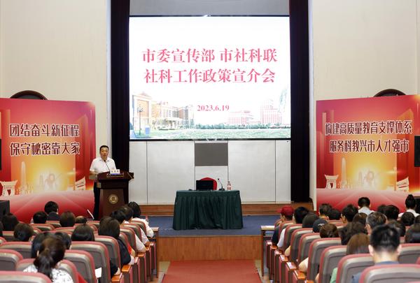 调研后,市委宣传部理论处(市社科工作办)、市社科联智库工作部开展送政策送服务进基层活动,举办社科工作政策专场宣介会。会上,王庆杰宣介《天津市“十四五”时期哲学社会科学发展规划》重点任务和有关政策措施。江立云宣介中国特色新型智库建设情况。张龙飞宣介国家社科基金项目申报管理政策。周凤雅宣介天津市社科规划项目申报管理政策。我校各教学科研单位分管科研工作负责人,在研的国家社科项目和天津市社科规划项目负责人,以及科研骨干教师代表参加宣介会。