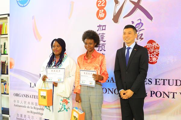 中国驻加蓬大使馆公参朱小乐为二等奖获得者颁奖