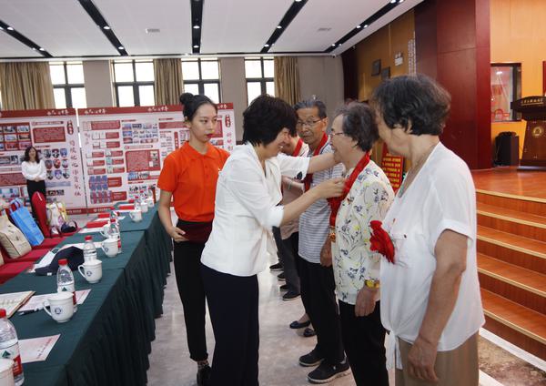 校党委书记周红蕾为“光荣在党50年”老党员代表佩戴纪念章