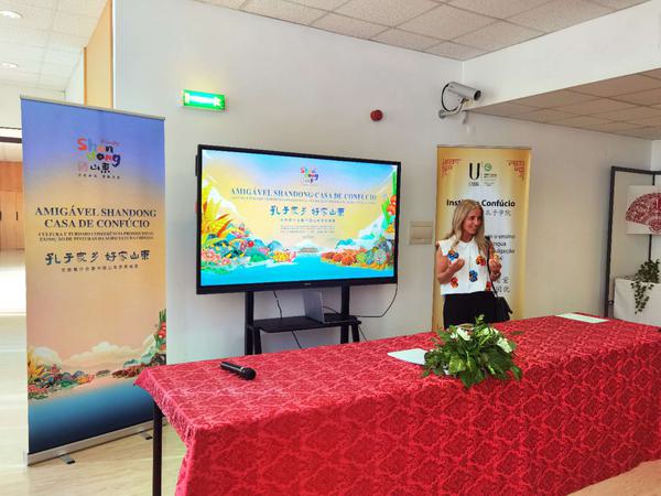 在“孔子家乡 好客山东”文旅推介会上,亚历山大·罗莎致欢迎辞,她表示,孔子学院始终致力于中国文化的推广,已成为中葡文化交流的重要平台,此次活动将向葡萄牙各界人士展示山东的深厚文化和特色旅游资源。甘萍表示,孔子学院为促进中葡两国文化交流发挥着重要作用,本次活动从形式到内容都达到了很高的水平,取得了很好的效果。付俊海对孔子学院的支持表示感谢,并对山东的文化旅游资源进行了重点推介。罗德里格斯对本次推介活动在里斯本大学成功举办表示祝贺,希望孔子学院在中葡文化交流方面作出更多贡献。