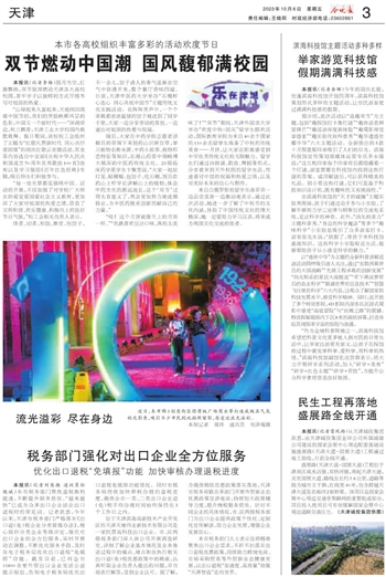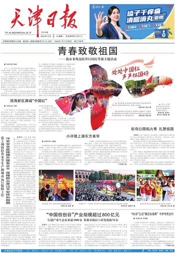 10月2日,《天津日报》头版头条刊发文章《青春致敬祖国──我市多所高校举行国庆升旗主题活动》,报道我校在两校区举行“青春心向党 奋斗正当时”国庆升旗仪式。活动现场,师生代表200余人同唱《歌唱祖国》,“青马班”学员代表杨雅雯、霍小玥在国旗下倡议同学们,勇做走在时代前列的奋进者、开拓者、奉献者。