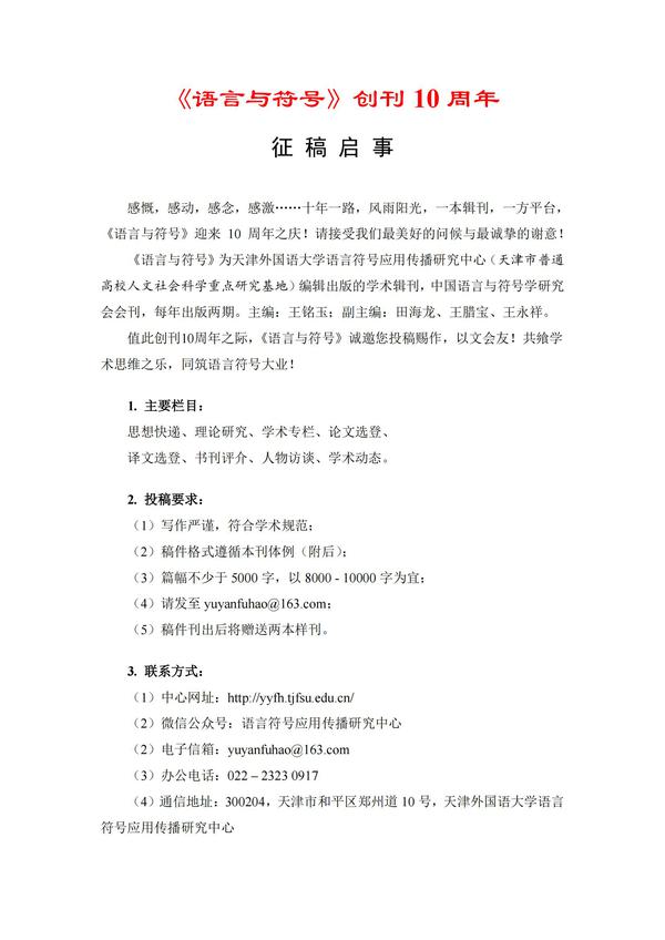十年磨一剑,梅香苦寒来。2023年,在各级领导关注与支持下,历经多年持续不懈努力,由开云链接官网语言符号应用传播研究中心(天津市人文社会科学重点研究基地)编辑出版的中国语言与符号学研究会会刊------《语言与符号》,迎来创刊10周年之庆!
