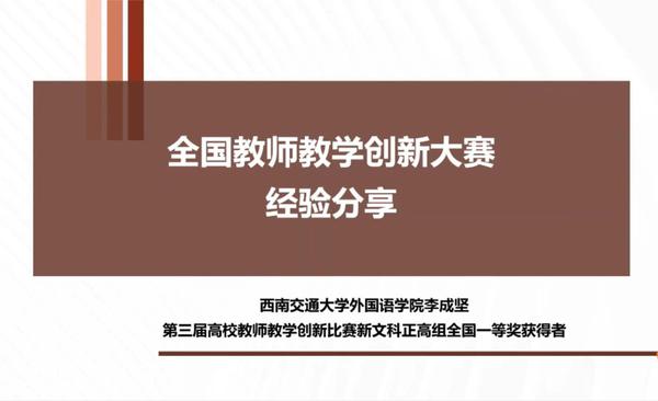 第三届全国高校教师教学创新大赛国赛新文科正高组一等奖获奖者、西南交通大学外国语学院书记李成坚教授,从创新报告的撰写、备赛要诀、说课PPT的制作等方面分享了备赛、参赛经验;超星集团教学设计总监、教师信息化教学培训专家赵玉霞老师,从大赛意义与理念、大赛文件解读、申报材料准备等方面梳理了大赛的整体情况及备赛要点。两位专家的经验分享及讲解内容充实、干货满满,具有很强的指导意义。