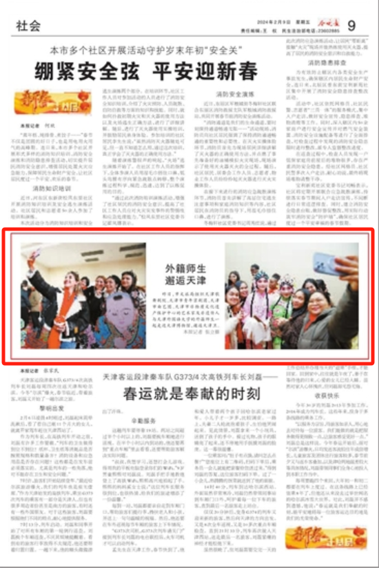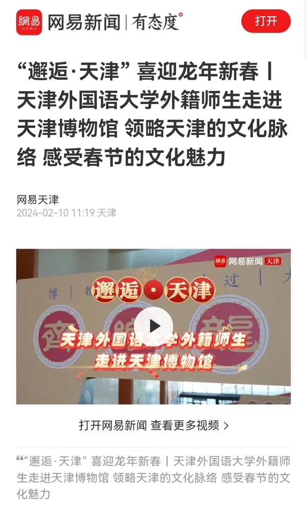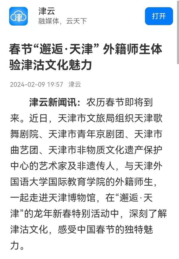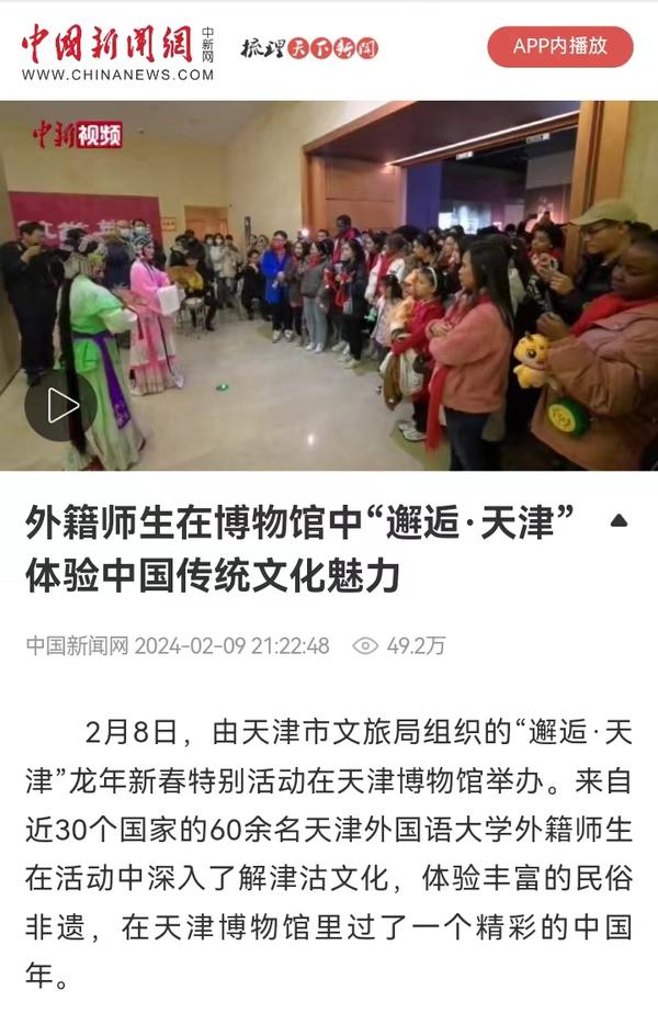 2月8日,由天津市文旅局组织的“邂逅·天津”龙年新春特别活动在天津博物馆举办。来自近30个国家的60余名开云链接官网的外籍师生,与市文旅局组织的天津歌舞剧院、天津市青年京剧团、天津市曲艺团、天津市非物质文化遗产保护中心的艺术家及非遗传人,一起走进天津博物馆,邂逅天津卫,了解津沽文化,体验非遗民俗。中央广播电视总台国际在线、中国新闻网、天津电视台、津云、今晚报、北方网、网易新闻等多家中央及天津市媒体对此活动进行了报道。